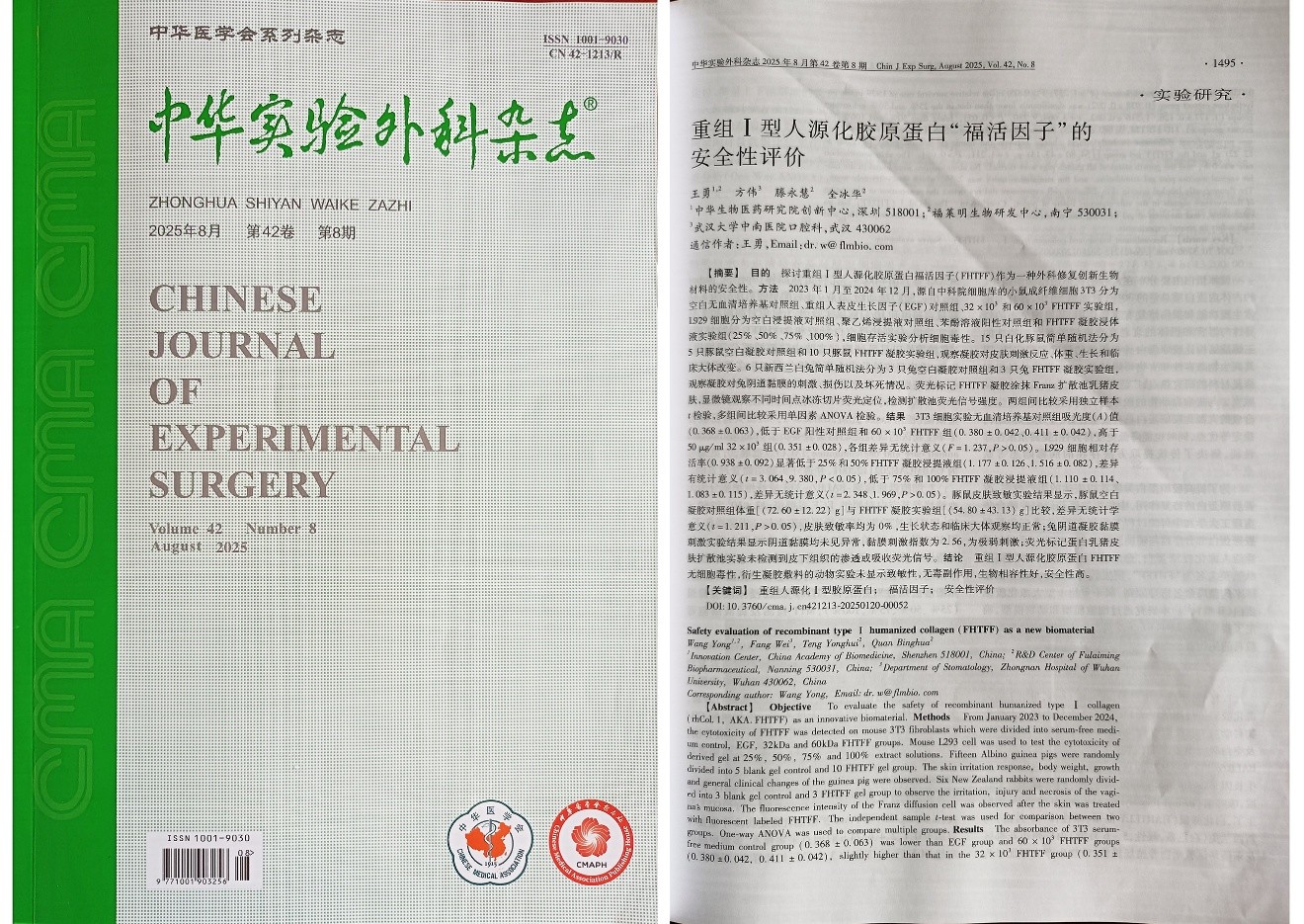 福萊明生物聯合華南理工大學、中華生物醫藥研究院等科研機構,在國家核心期刊發布了重組 I 型人源化膠原蛋白(福活因子FHTFF)的研究成果。