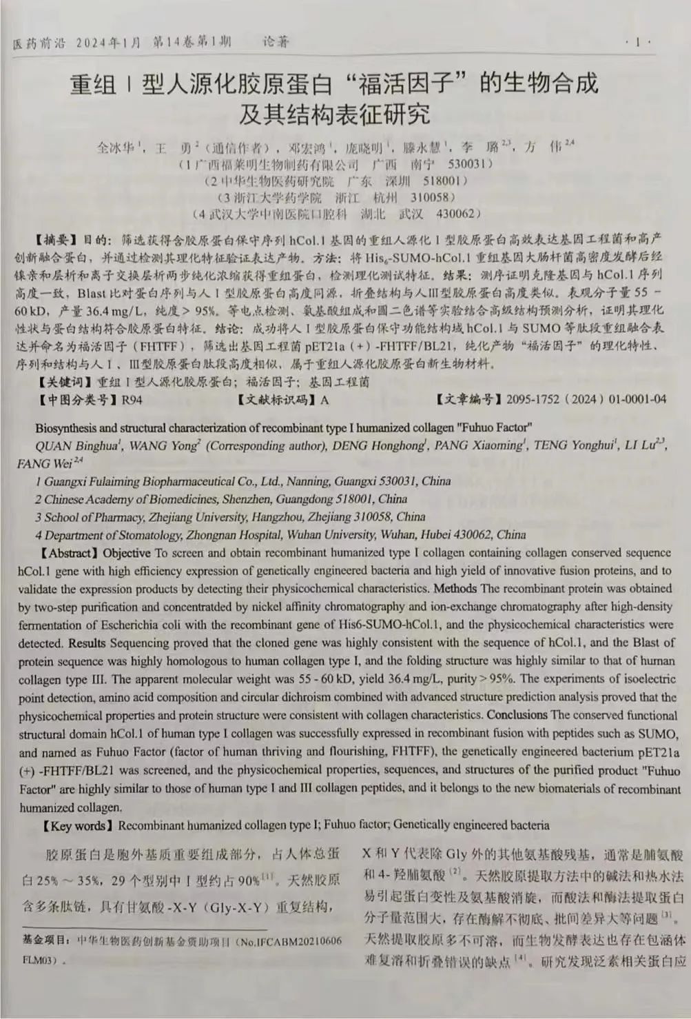 由(you)福萊“明(ming)生(sheng)物聯合中華生(sheng)物醫(yi)藥研(yan)究院、浙江(jiang)大學(xue)藥學(xue)院、武漢大學(xue)中南醫(yi)院和華南理工大學(xue)的(de)科(ke)學(xue)家們,在國家科(ke)技(ji)期刊《醫(yi)藥前沿(yan)》雜志,以2024首(shou)卷首(shou)頁(ye)首(shou)篇文章,發表了《重組 I 型(xing)人源化膠(jiao)原蛋白(福活因子)》的(de)最新研(yan)究成(cheng)果。