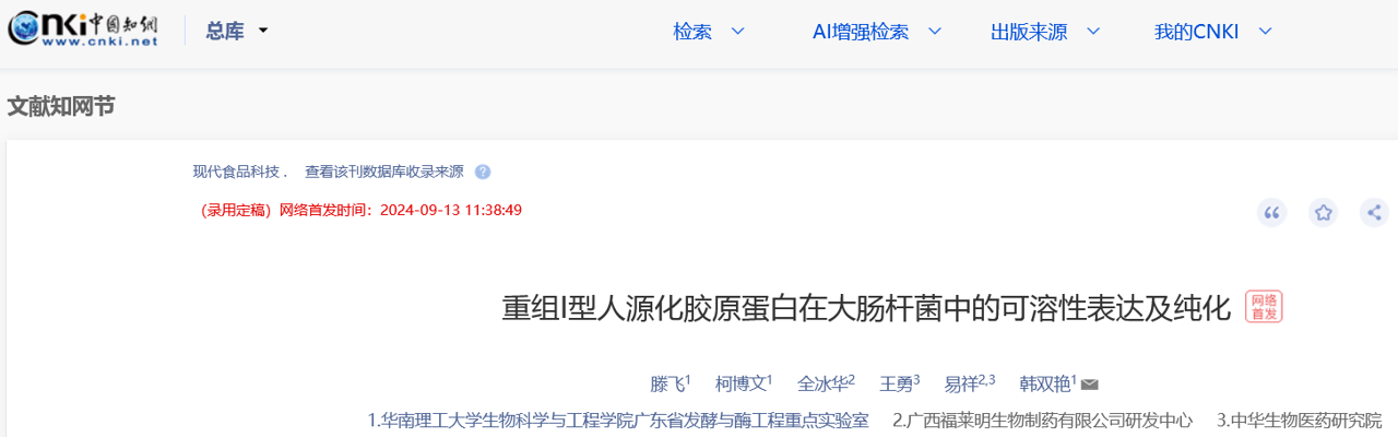 在國家重點研發計劃項目(2021YFC2102700)的基金資助下,福萊明生物研發中(zhong)心聯合華南理工大學(xue)生物科學(xue)與工程(cheng)學(xue)院廣東省發酵與酶(mei)工程(cheng)重點(dian)實驗室、中華生物醫藥研究院等科研機構,在北大核心期刊《現代食品科技》發表了重組 I 型人源化膠原蛋白(福活因子FHTFF)的研究成果。DOI:10.13982/j.mfst.1673-9078.2024.12.1449。