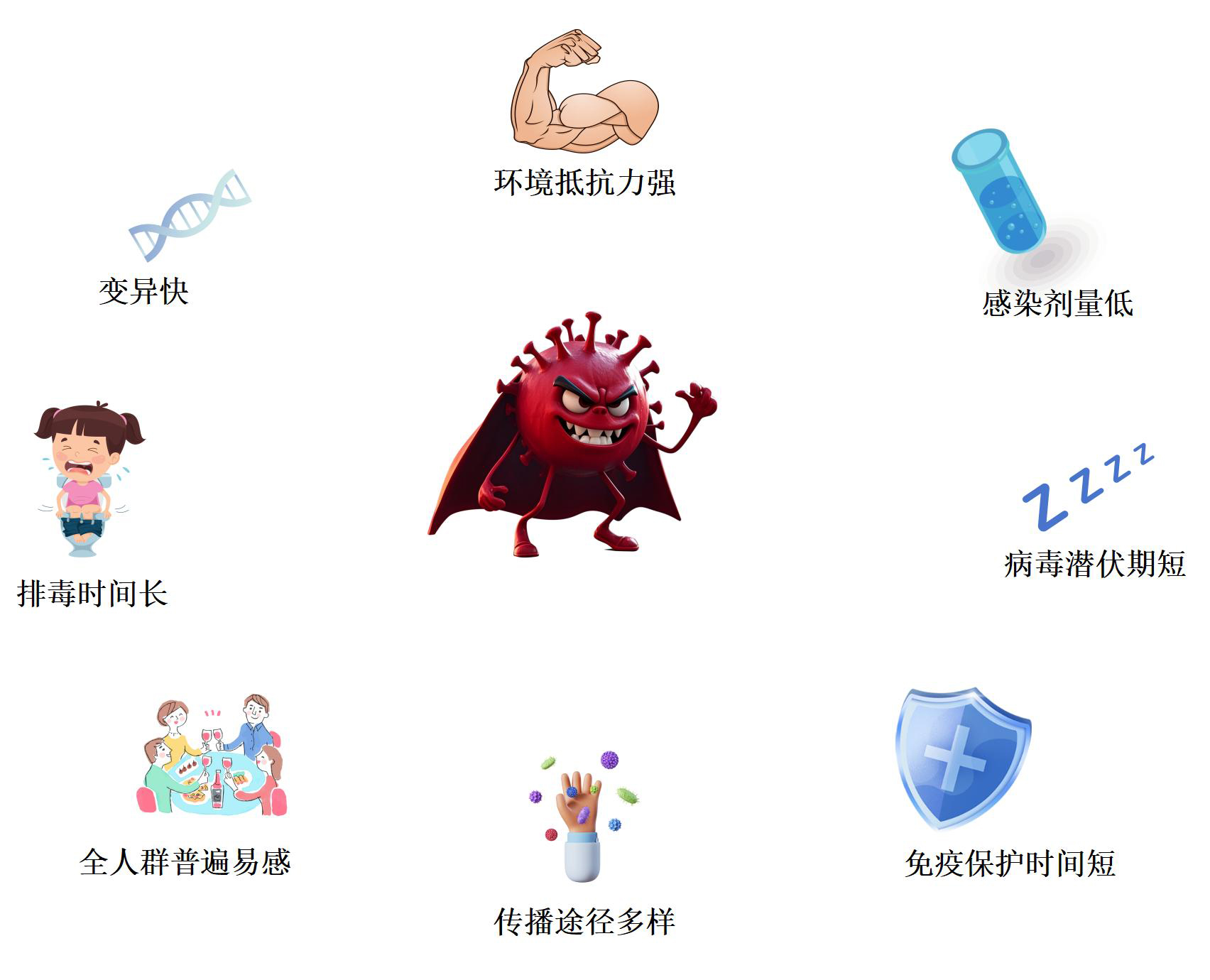 諾如病毒具有(you)全人群普遍易感(gan)(gan)、感(gan)(gan)染(ran)劑量(liang)低(di)(18個(ge)病毒顆粒即(ji)可感(gan)(gan)染(ran))、潛伏期(qi)短(duan)(24-48小時(shi))、排(pai)毒時(shi)間(jian)長(chang)(高峰在發病后(hou)2-5天,持續(xu)(xu)約2-3周)、環境抵抗(kang)力強(0-60℃存活)、免(mian)疫保(bao)護時(shi)間(jian)短(duan)(持續(xu)(xu)6-24個(ge)月(yue),同一(yi)個(ge)體可重復感(gan)(gan)染(ran)同一(yi)或不同毒株)等(deng)特點。感(gan)(gan)染(ran)后(hou)的臨床癥(zheng)狀(zhuang)輕,可自愈,主要嘔吐(兒童),腹瀉(成人),水(shui)樣便(無(wu)血便)。也有(you)伴或不伴低(di)燒、惡(e)心、腹痛、頭痛、畏寒和。高齡老人和免(mian)疫低(di)下兒童可有(you)重癥(zheng)發生。