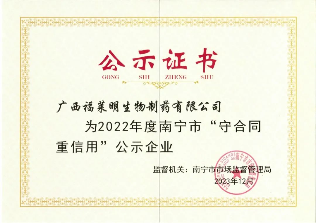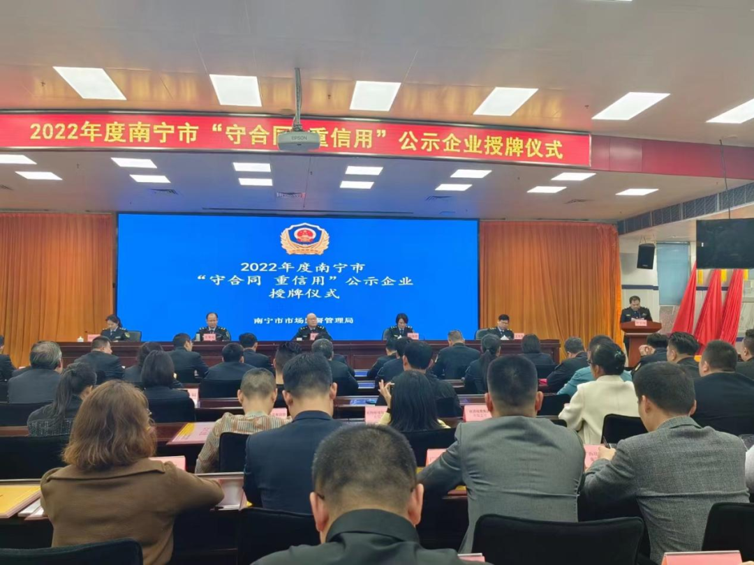 近日,我(wo)公(gong)(gong)司(si)榮獲(huo)由南寧市(shi)市(shi)場(chang)監督管理局授予的(de)(de)“守(shou)合同 重信用”企業(ye)稱號。獲(huo)此殊榮,是(shi)政府部門(men)對我(wo)公(gong)(gong)司(si)信用記(ji)錄、經營狀況、發展前景、社會口碑、市(shi)場(chang)品牌、公(gong)(gong)眾認(ren)可(ke)度(du)以及核心競(jing)爭力的(de)(de)高度(du)認(ren)可(ke),對公(gong)(gong)司(si)進(jin)一步增強市場(chang)競爭力(li),提(ti)升競爭優勢(shi)具有重要意義。