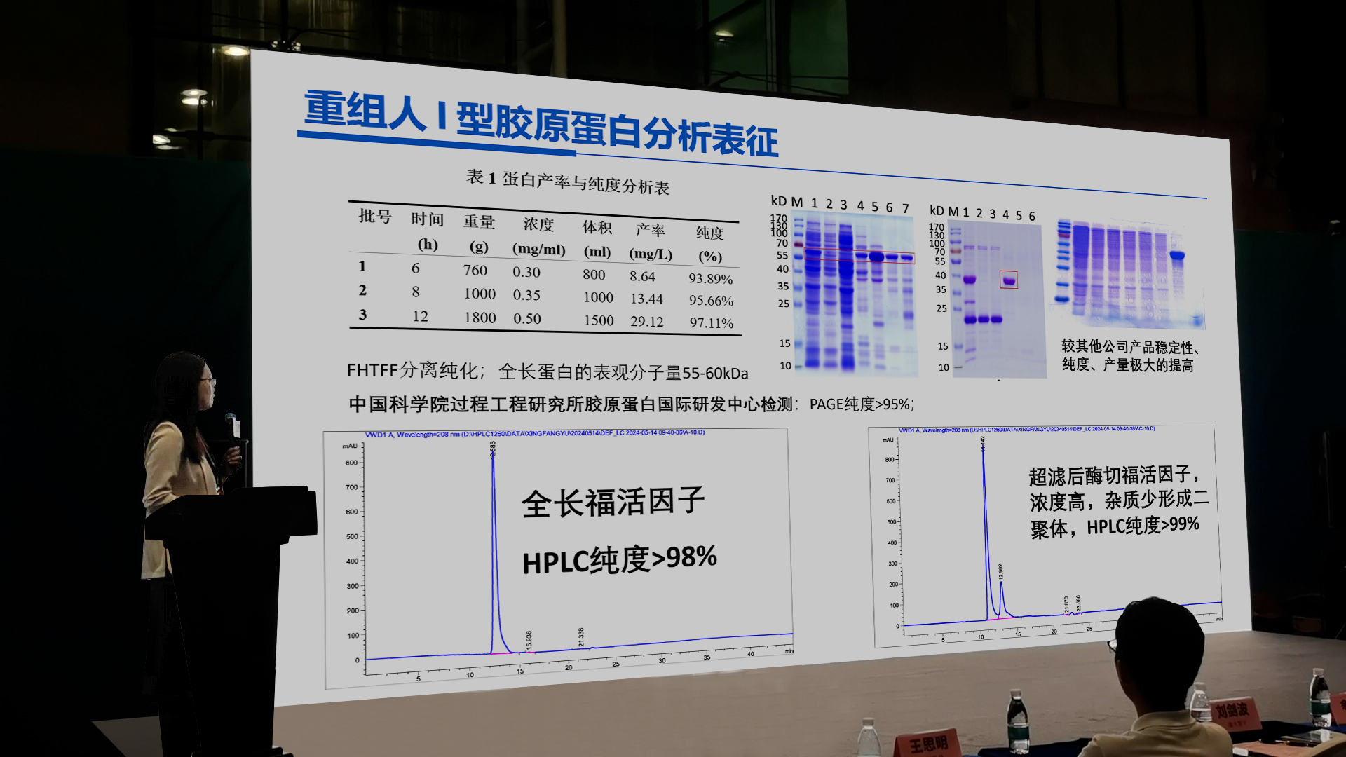 膠原(yuan)蛋(dan)(dan)白(bai)因其獨(du)特的(de)生物(wu)相容性和多(duo)(duo)種功能(neng)特性,在(zai)醫(yi)療和美(mei)容領域應(ying)用廣泛(fan),但其多(duo)(duo)樣性和復雜性也給質量(liang)控(kong)制帶來挑(tiao)戰。中國科學院張貴鋒研究員團隊(dui)通過生物(wu)質譜技術,篩(shai)選不(bu)同(tong)類(lei)型(xing)膠原(yuan)蛋(dan)(dan)白(bai)的(de)特征多(duo)(duo)肽,成(cheng)功實(shi)現分子水平溯源。這種高(gao)通量(liang)質譜定量(liang)分析方法,能(neng)夠準確(que)地鑒定和定量(liang)不(bu)同(tong)種屬、亞型(xing)的(de)膠原(yuan)蛋(dan)(dan)白(bai),能(neng)在(zai)低至2ng/ml、3ng/g和2ng/g的(de)(de)(de)濃度下,對液體、膏狀和凝(ning)膠(jiao)(jiao)敷(fu)料中的(de)(de)(de)膠(jiao)(jiao)原(yuan)蛋白進行痕量檢測。張貴(gui)鋒團隊高(gao)建萍博士,還展示了中國科學(xue)院膠(jiao)(jiao)原(yuan)蛋白國際研發中心(xin)對福(fu)萊明生物(wu)原(yuan)研創新的(de)(de)(de)福(fu)活因子(重組(zu)I型(xing)人(ren)源化(hua)膠(jiao)原蛋(dan)白)、融合因(yin)子(zi)(重組類膠(jiao)原蛋(dan)白)的表(biao)征(zheng)分析研(yan)究,結果顯示:福活因(yin)子不僅PAGE電泳純度高于95%,HPLC液相色譜純度更是達到99%以上。